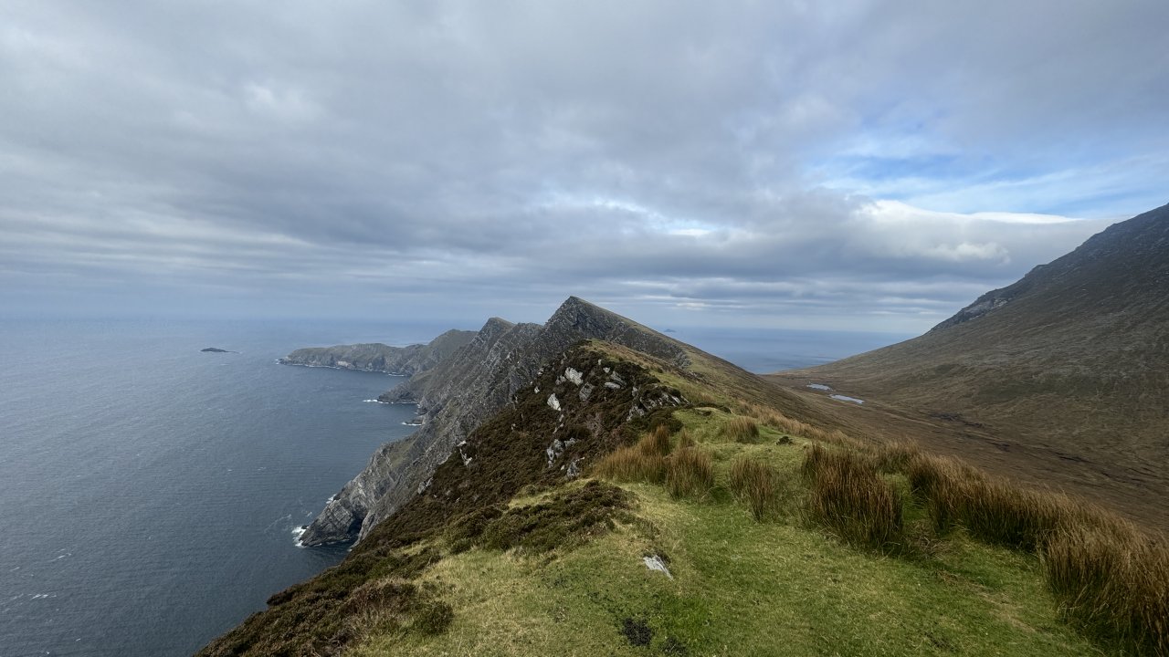 Croaghaun Mountain on Achill Island boasts Ireland's highest sea cliffs, soaring 688 metres above the wild Atlantic. This challenging hike takes you along dramatic cliff edges with breathtaking views of the Atlantic coastline, Clare Island, and the surrounding Mayo landscape and beyond. This landscape is full of history and stories, the terrain is rugged, exposed, and utterly spectacular, a challenging but unforgettable hike for those who take it on.